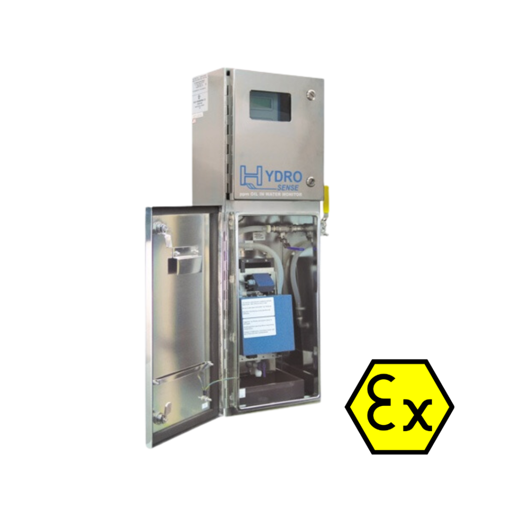 A continuous sample flow is tapped or pumped off the process line and directed through the HydroSense chamber. It passes behind the non-contacting UV light source and is targeted with filtered light energy. The soluble and emulsified oils in the water will excite from this light energy and fluoresce light energy back out of the water at a signature wavelength. The intensity of light energy at this wavelength is measured to provide an indication of the ppm concentration.