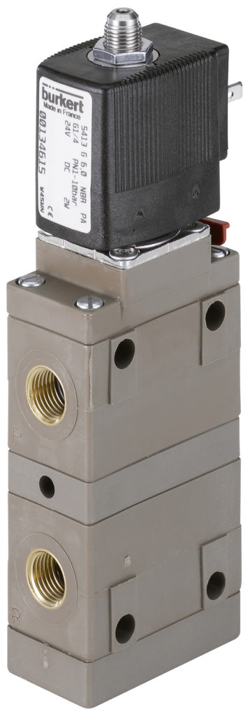 Type 5413 is a 4/2 way solenoid valve with a poppet design. An epoxy-encapsulated 3/2 way pilot solenoid valve provides the control.