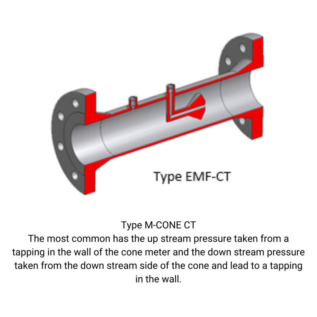 The EMCO cone meter is used for flow measurement of liquid, steam and gas according to the differential pressure principle. The differential pressure is measured with a differential pressure transmitter between the upstream tapping in the wall of the cone meter and the down stream tapping in the cone. The inlet cone has a good flow conditioning effect, especially for small beta values. Larger size cone meters are furnished with vanes to improve the flow conditioning effect and provide mechanical support of the cone.