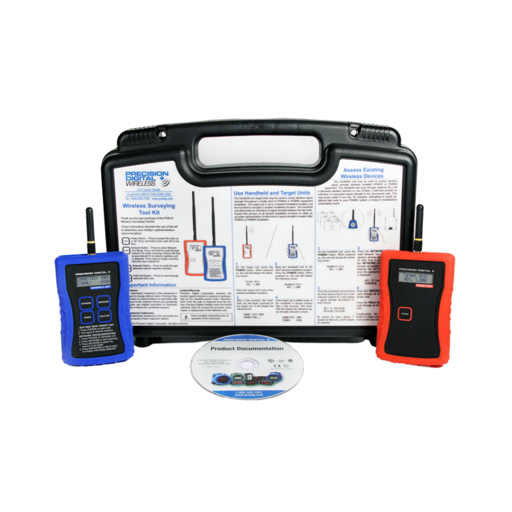 The PDA10 is a wireless surveying tool kit which is intended to be used in conjunction with PDW30 or PDW90 wireless products. The surveying tool kit comes with two units: a handheld unit and a target unit. Use the pair prior to wireless system installation to demonstrate signal strength throughout the facility or between intended installation locations. The handheld unit may be used standalone after installation in order to determine received signal strength from all of the devices in order to determine new field unit locations or to troubleshoot connectivity issues.