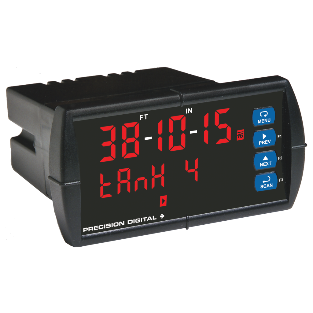 Its unique feet & inches upper LED display can indicate up to 99 feet, 11 and 15/16 inches. The 6-digit lower display can indicate units, tags, or other variables such as volume, temperature, or density. The PD6081 also has dual analog inputs, for integrating traditional 4-20 mA or voltage inputs in the display scanning. The PD6081 can be setup as a Modbus master, slave, or snooper. Like all ProVu meters, the PD6081 includes UL / C-UL listing and CE marking, a NEMA 4X front, and AC or DC power options. Various math functions may be applied to the analog or Modbus inputs, such as addition, difference, average, and ratio.